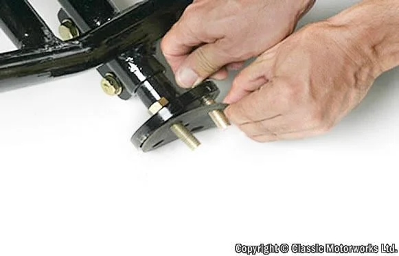 To position the tube between the clevis tab now bolted to the shock mount, and the car frame it may be necessary to rotate one or both clevis tabs. The tube also can be telescoped and/or rotated to fit between the car and the motorcycle. A light tapping with a rubber mallet may need to be used for positioning.