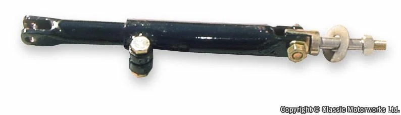 Release the clamp bolts and remove the clamp halves. Release the pivot bolts slightly to allow positioning of the steering dampener to the sidecar frame and to the motorcycle fork lower leg (don't forget the rubber between the fork leg and the clamp). It is best to get as much travel as possible in the dampener without reducing side to side steering movement. Achieve this by mounting the fork clamp high, just below the fender tabs. The small end can be moved as far rearward as possible toward the cross member. See pictures below.